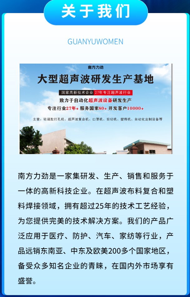 超聲波手術衣機的問世讓醫療領域煥發出新的活力。它不僅節約了生產成本,還提高了生產效率,確保了手術衣的質量和環境友好。作為行業領先廠商,南方力勁在超聲波設備行業擁有27年的研發生產經驗,致力于為醫療行業提供最優質的產品及創新解決方案。超聲波手術衣機就是其中的杰出代表,為我們帶來了更安全、更健康的未來