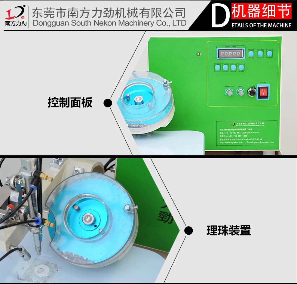 東莞市南方力勁機械有限公司是生產超聲波釘珠機的企業,經過公司不斷的研發、設計,現已開發出南方力勁牌單、雙盤釘珠機。釘珠速度達到每分鐘150粒,南方力勁自主設計研發的珠盤亞克力護罩,減少鉆石在加工過程中跳珠盤散落造成浪費,節約了成本。
