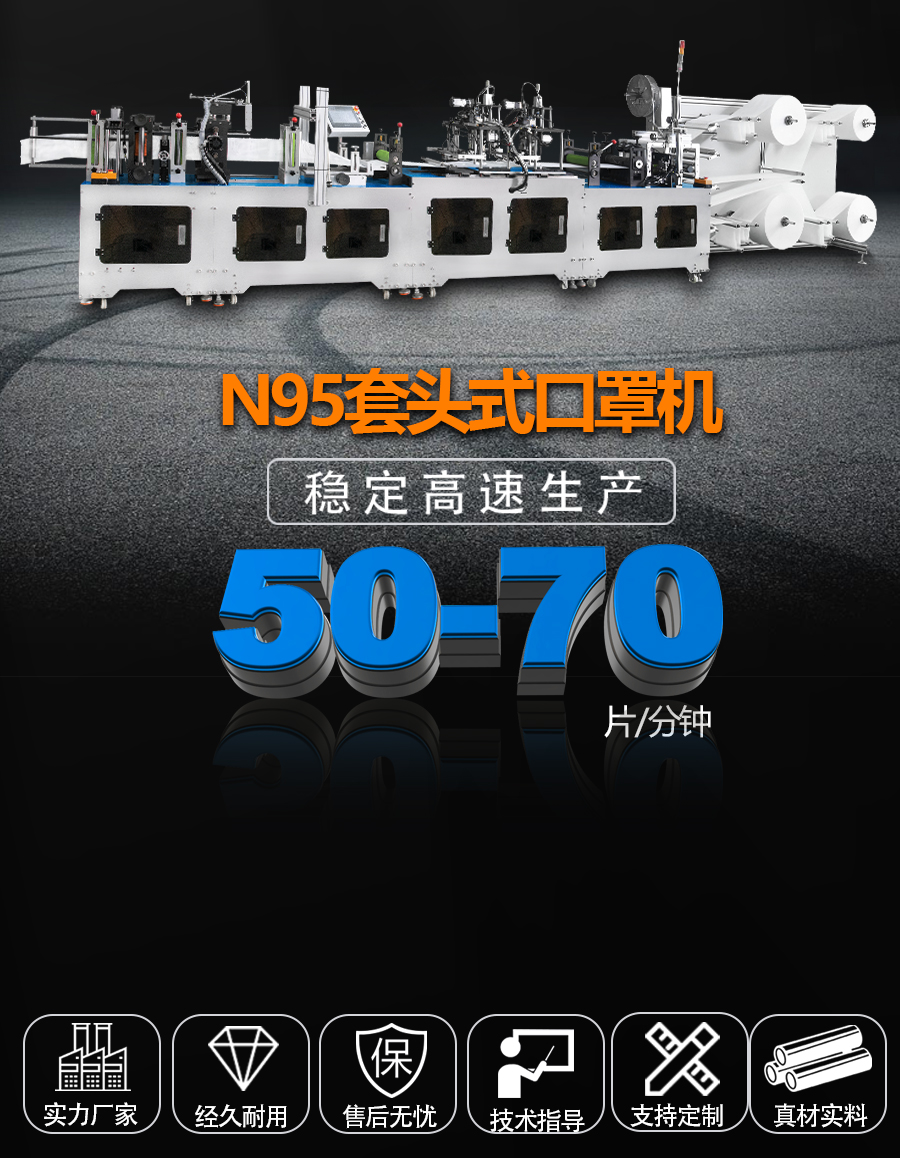 南方力勁頭套式KN95口罩機采用一體化機型設(shè)計,實現(xiàn)全自動化生產(chǎn),每分鐘產(chǎn)能40-70個,是生產(chǎn)外科用KN95口罩的必選設(shè)備。