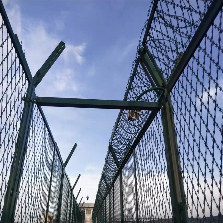 金屬鋼網墻立柱的頂部焊接V型彎頭,這種立柱也叫做Y型立柱,頂部用以架設蛇腹形刀剌網,與下部的金屬鋼網墻完美結合,形成一道難以逾越的銅墻鐵壁。