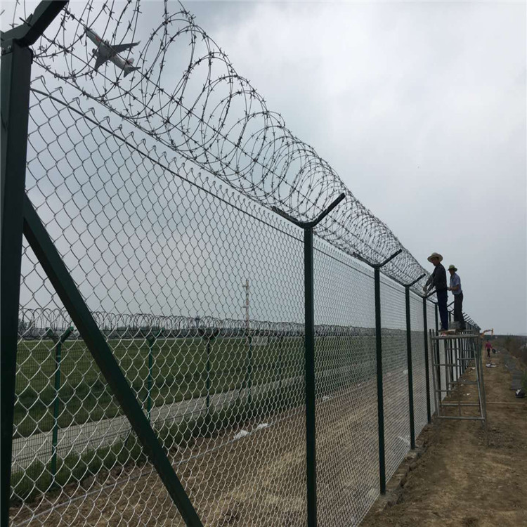 鋁包鋼機場圍界是新型的機場隔離網,它是由Y型燕尾立柱、鋁包鋼勾花網、鋁包鋼剌絲網組成,鋁包鋼機場圍界具有獨具匠心的鋼絞線穿插式連接立柱和網片,在保證美觀大方的同時,能夠承受20kN推力的鋁包鋼絞線使整體圍界足夠堅固耐用。鋁包鋼線的制作方法是在鋼絲上包覆一層鋁,包覆方法為Conclad擠壓法,也有采用粉末冶金技術將鋁粉末包到鋼絲上,包鋁后可冷拔以提高強度。這是一種較難制造的金屬線 ,尤其是