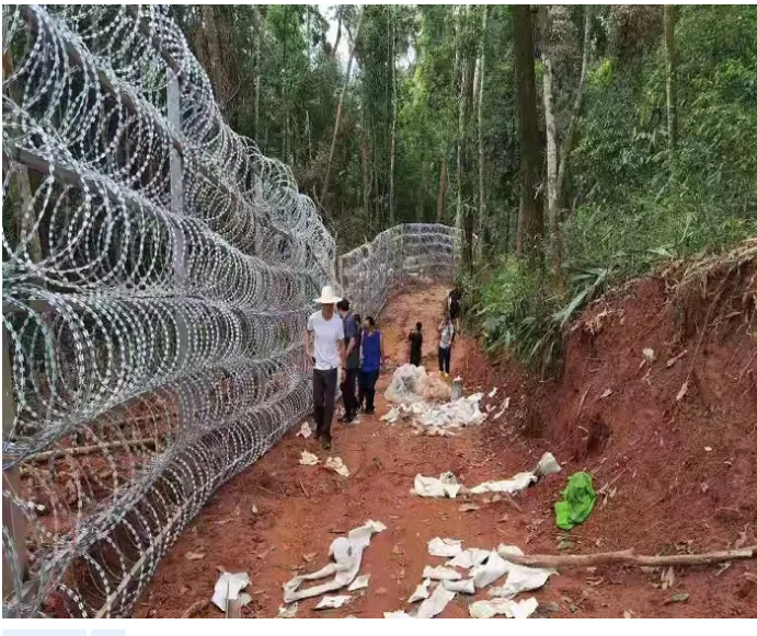 云南邊境防疫鋼鐵長城采用蛇腹型刀片鐵絲網,刀片剌網又名刮刀型刺絲,是一種發展起來的防護、隔離能力較強的新型防護網產品。鋒利的刀型刺由雙線扣裝后成蛇腹狀,既美觀又讓人不寒而栗。起到了很好的阻嚇作用。同時該產品具有美觀、防阻效果好、施工便利等優點。