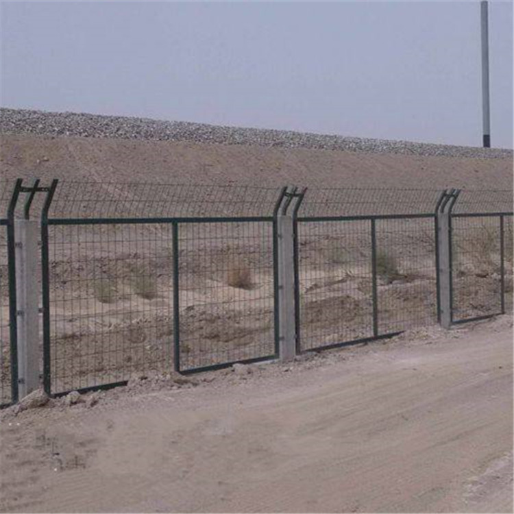 鐵路防護柵欄又稱鐵路隔離柵是用于鐵路兩側的隔離防護設施起隔離和防護作用的護欄網產品,應用于高速公路、鐵路、高鐵、大型場地安全防護用。采用高強度低碳鋼絲、鋁鎂合金絲,或鍍鋅絲編織焊接而成,具有組裝靈活、結實耐用的特點,既可以制作成護欄網墻使用,也可以用做臨時隔離網,在使用中只需采用不同的立柱固定方式便可安裝(立柱還包括水泥柱子),產品防腐 防曬 防水表面處理有、電鍍、熱鍍、噴塑、浸塑的方式。鐵路護欄在國內許多高鐵、高速公路 等道路兩側大量使用。產品表面顏色為墨綠色和草綠色,鍍層厚度為0.5~0.6mm,鍍粉采用抗老化性能的進口耐候性樹脂粉料,表面光滑。鐵路防護柵欄邊框有角鐵或者鋼管兩種焊接方式。