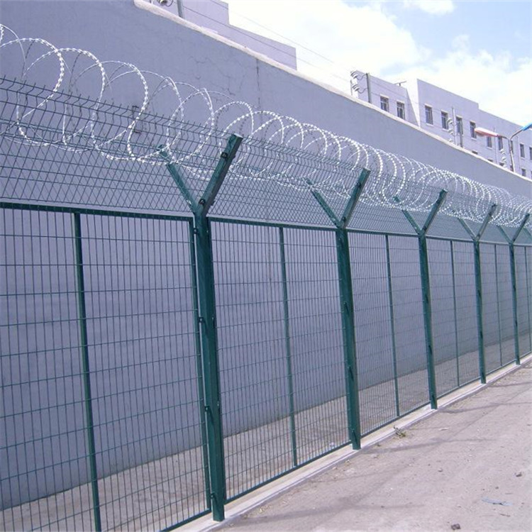 監獄鋼網墻又稱作“Y型安全防御護網”,是由V型支架立柱,加強型焊接片網,安全防盜連接件和熱鍍鋅刀片刺籠組成強度和安全防御性級別很高。近年來,被廣泛應用在監獄,軍事基地等高安全場所。在監獄鋼網墻頂部加裝刀片剌絲、刀片剌繩后又很好的增強了安全防護性能。采用電鍍、熱鍍、噴塑、浸塑等防腐形式,具有很好的抗老化抗曬、耐候等特點。產品造型美觀、花色多樣,既起到圍欄作用,又起到美化作用。