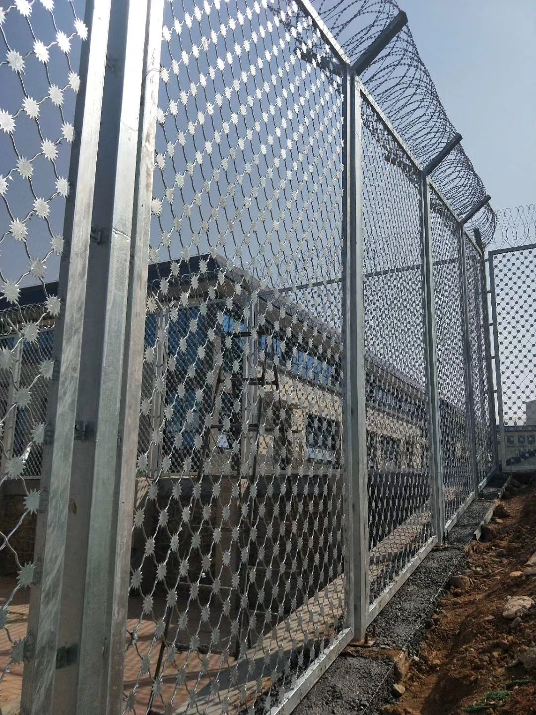 監獄鋼網墻又稱作"Y型安全防御護網”,是由V型支 架立柱加強型焊接片網,安全防盜連接件和熱鍍鋅刀片刺籠組成強度和安全