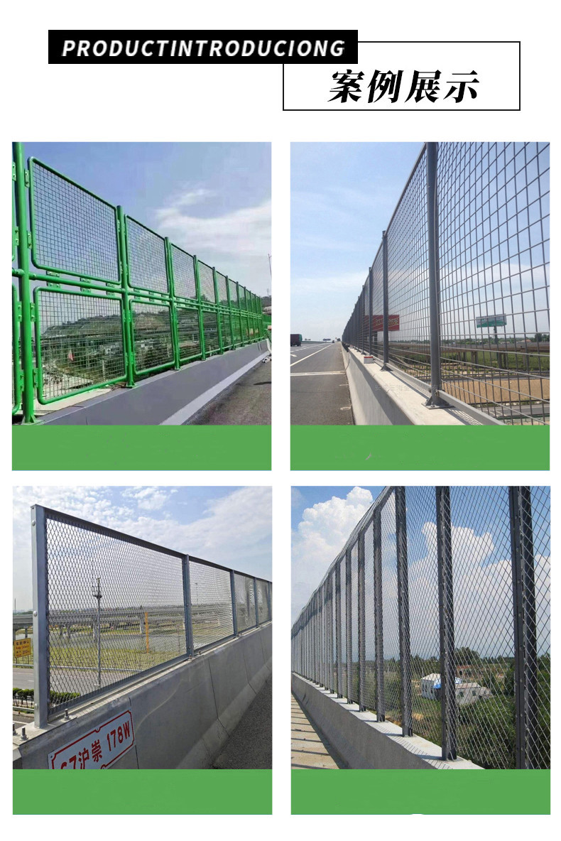 高速公路互通橋防拋防落網橋梁防落物網優(yōu)點: 1. 網身輕巧、造型新穎、美觀耐用; 2. 特別適合于橋梁防拋網; 3. 高效浸塑十年防銹; 4. 拆裝方便,重復使用性好,可根據需要對圍網重新布局; 5. 環(huán)保產品,最終可回收利用。高速公路互通橋防拋防落網橋梁防落物網外型新穎、橫向通透、美觀輕巧、 獨創(chuàng)風格、防眩效果特佳,避免夜間行車受對向車輛射出強光而影響視覺所造成的交通事故,保證了道路暢通和經濟效益。加熱浸鋅表面處理,防銹功能超過15年。本產品所采用的桃型柱、雙圈、波浪、雙邊護欄網等系列的專業(yè)產品具有網身輕巧、造型新穎、美觀、