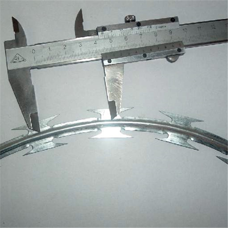 刀片刺絲又名刮刀型刺絲,是一種近年發(fā)展起來的防護、隔離能力較強的新型防護網(wǎng)產(chǎn)品。它采用鋼板沖壓成型包附于鋼絲(筋絲)之上,由銳利尖角鍍鋅鋼板或不銹鋼薄板做刀片,高張力鋼絲做芯線組合而成的。鋒利的刀型刺由雙線扣裝后成蛇腹?fàn)睿让烙^又讓人不寒而粟。起到了很好的阻嚇作用。該產(chǎn)品具有美觀、防阻效果好、施工便利等優(yōu)點。